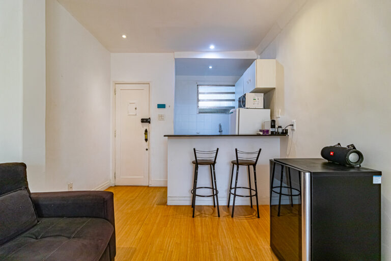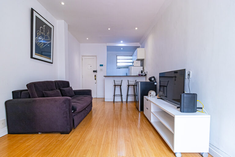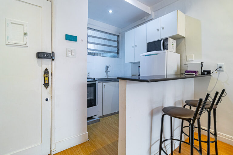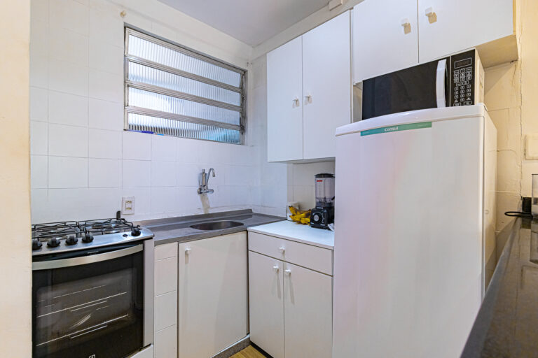 A sala tem um bom espaço e fica integrada à pequena cozinha americana, com vários armários, banquetas, geladeira, fogão e forno micro-ondas, que ficarão para quem comprar o apê.