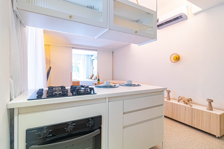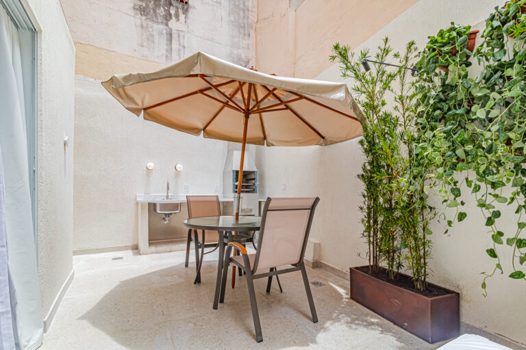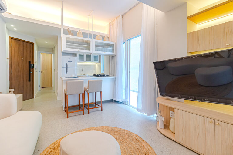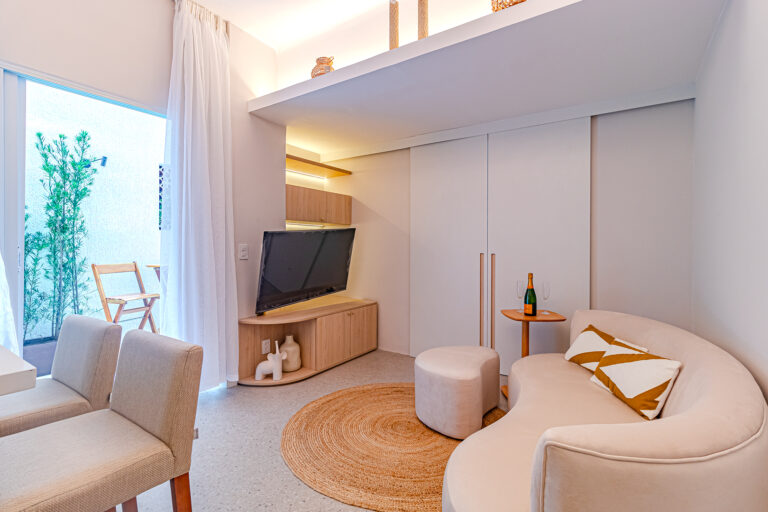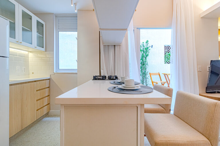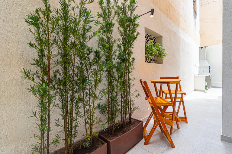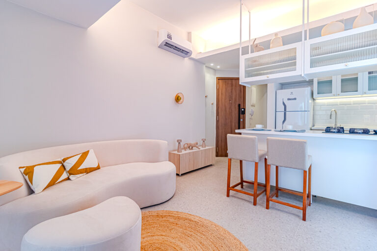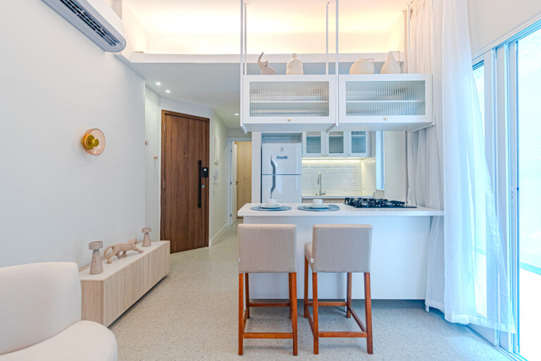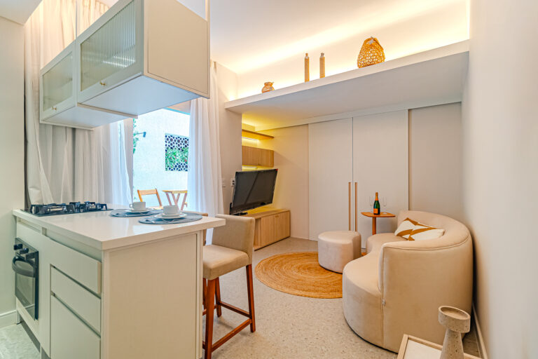 A sala é integrada à cozinha, formando um ambiente super acolhedor. Todo o apê é abraçado por uma aconchegante área aberta em “L”, com o cantinho de estar, churrasqueira, mesinha do chopp ou do vinho e uma lavanderia nos fundos.