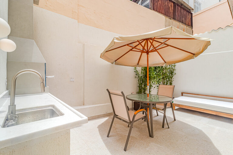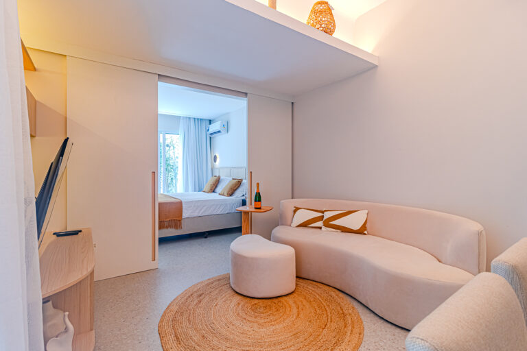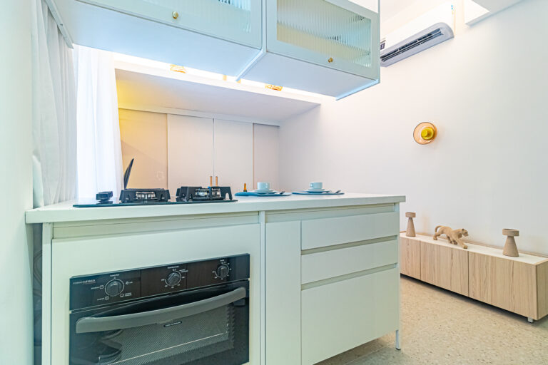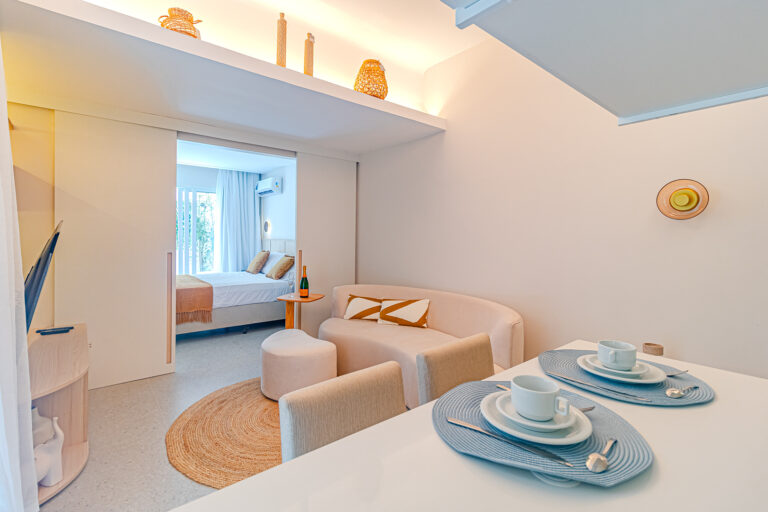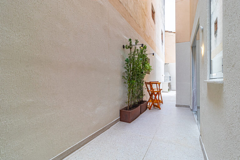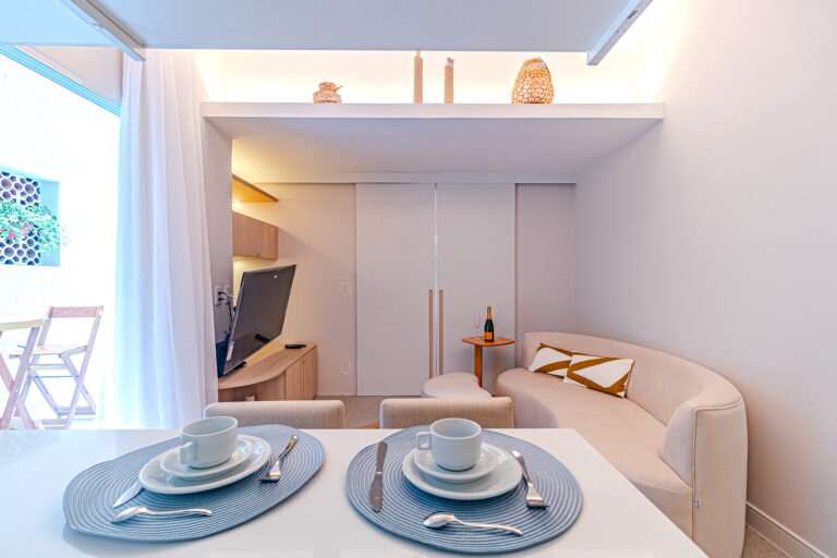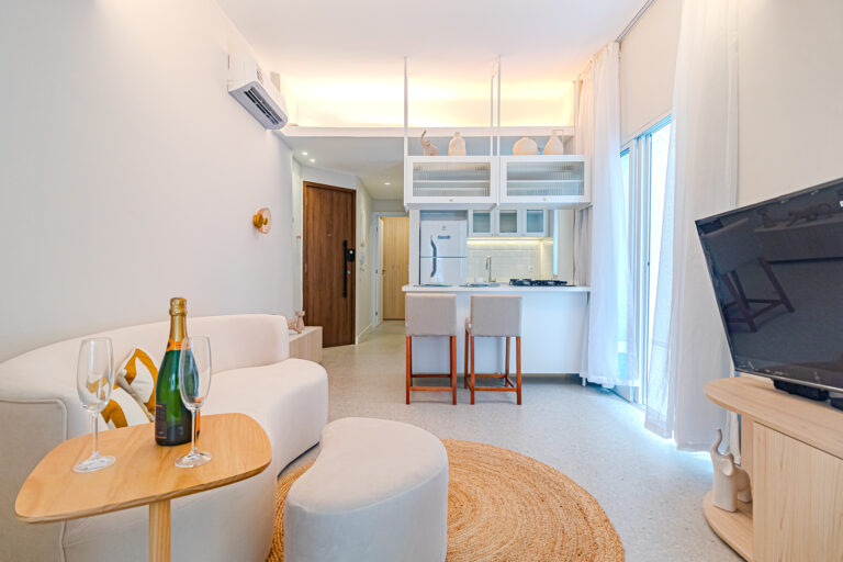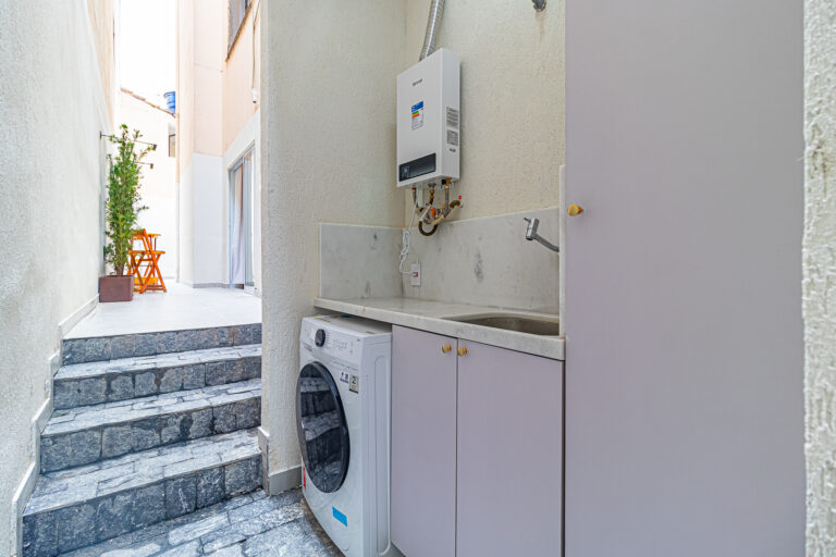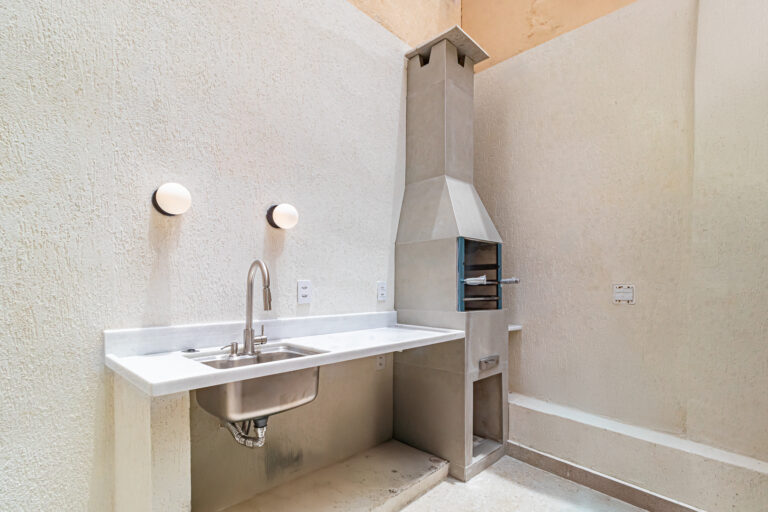 A sala é integrada à cozinha, formando um ambiente super acolhedor. Todo o apê é abraçado por uma aconchegante área aberta em “L”, com o cantinho de estar, churrasqueira, mesinha do chopp ou do vinho e uma lavanderia nos fundos.