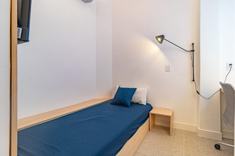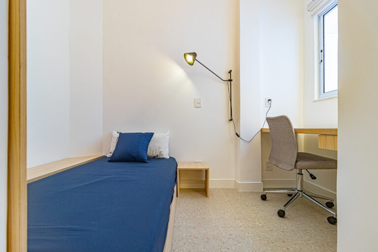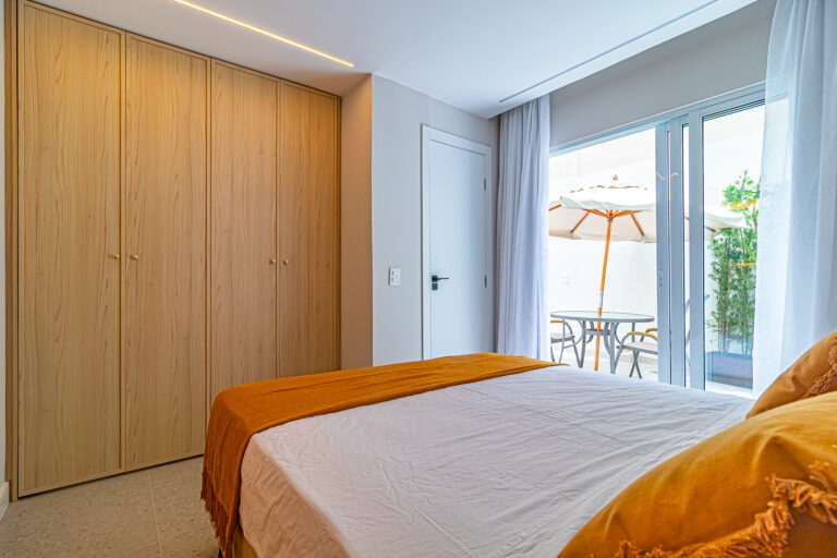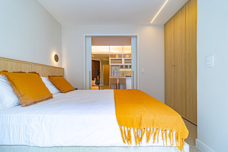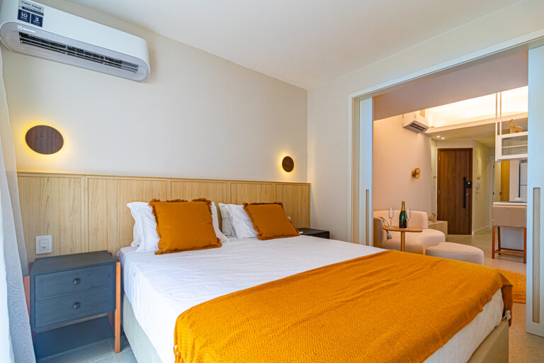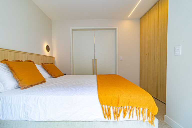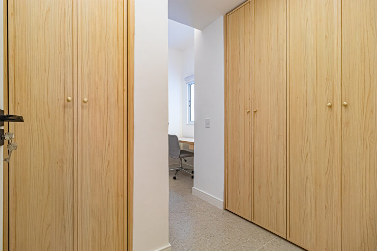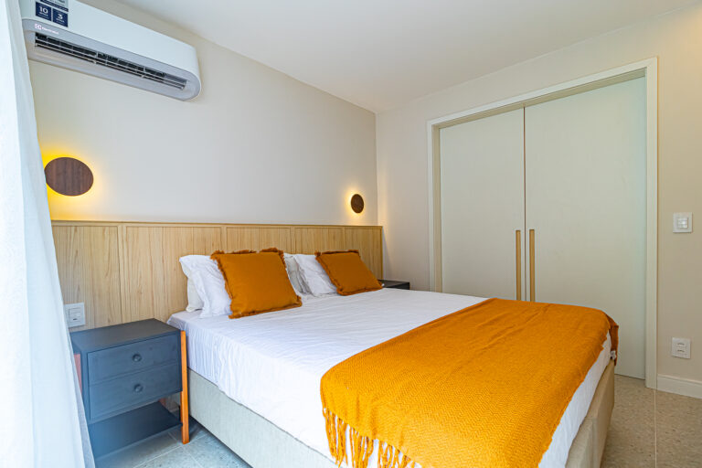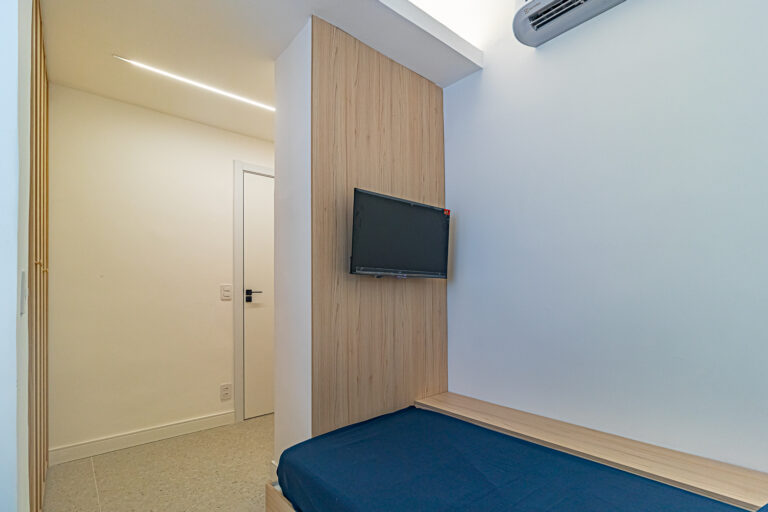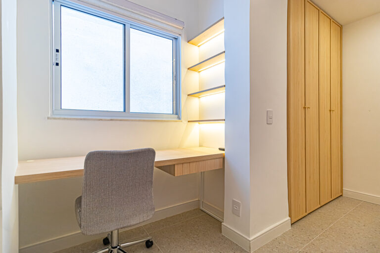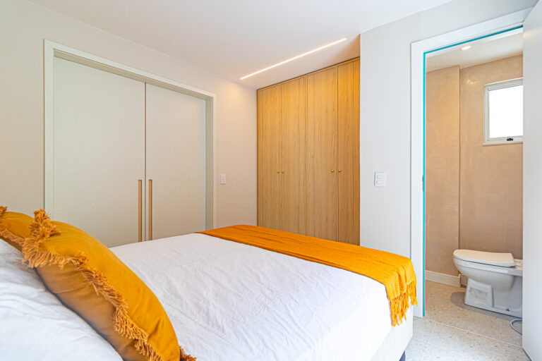 A área íntima tem 2 quartos e mais 1 banheiro social. Como o imóvel só tinha 1 banheiro, os proprietários fizeram um WC, com apenas um vaso sanitário e uma janela, no quarto do casal. O 2º quarto pode ser usado tanto como quarto, quanto escritório. Todos os cômodos contam com marcenaria planejada e aparelhos de ar-condicionado tipo split.