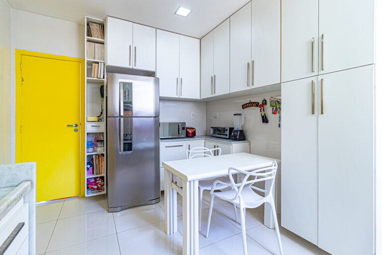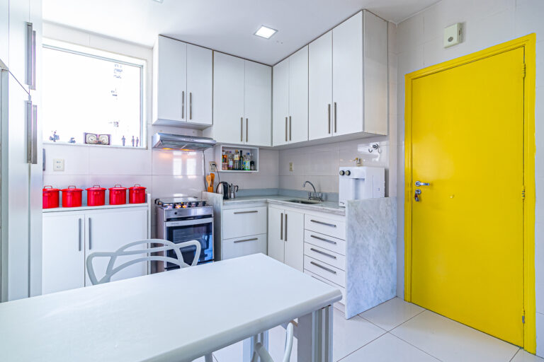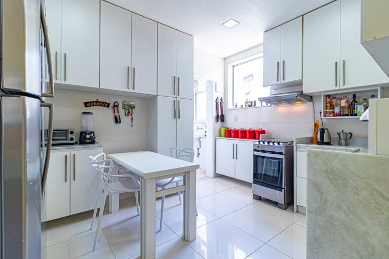 A cozinha é super gostosa. Tem o formato quadrado, é repleta de armários e uma mesa para refeições. Conta ainda com área de serviço e WC.