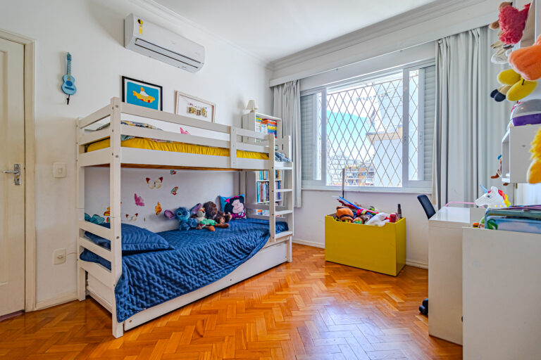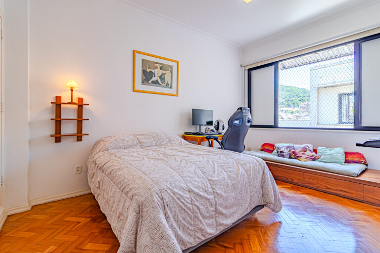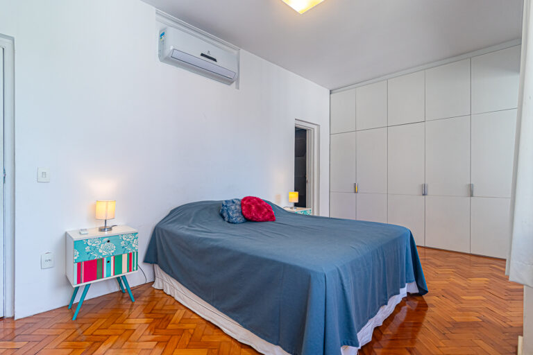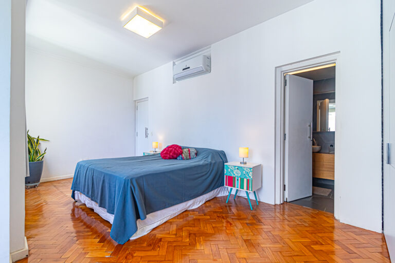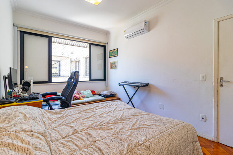 A área íntima tem 3 quartos, sendo 1 suíte e mais 1 banheiro social. Todos são grandes, têm piso de tacos e contam com armários e aparelhos de ar-condicionado tipo split.