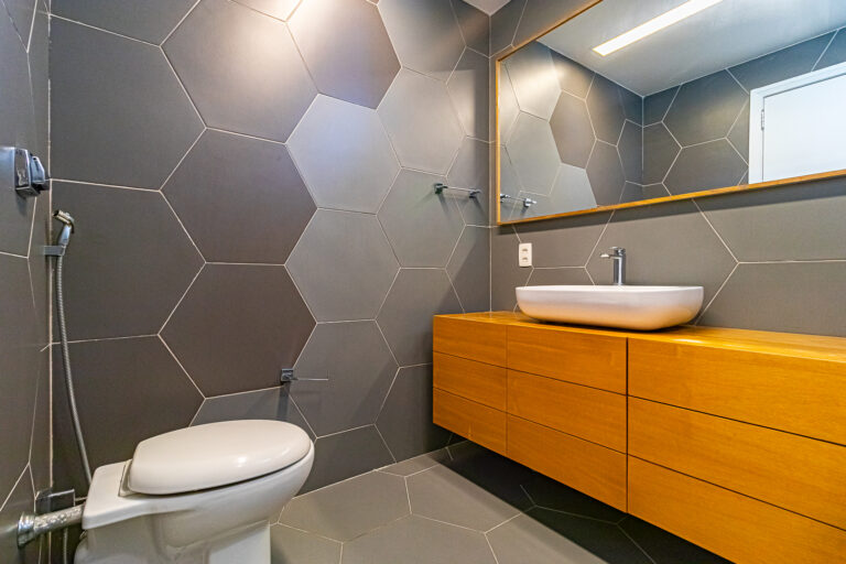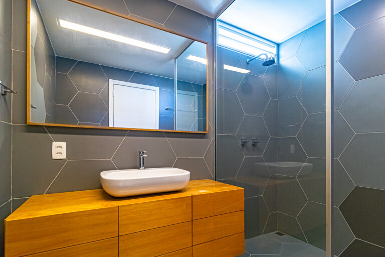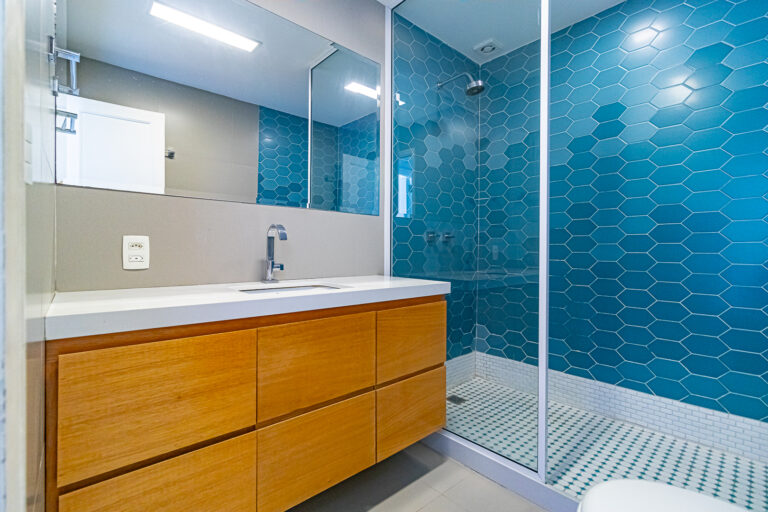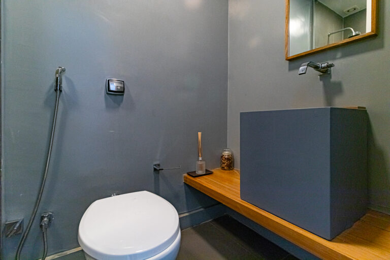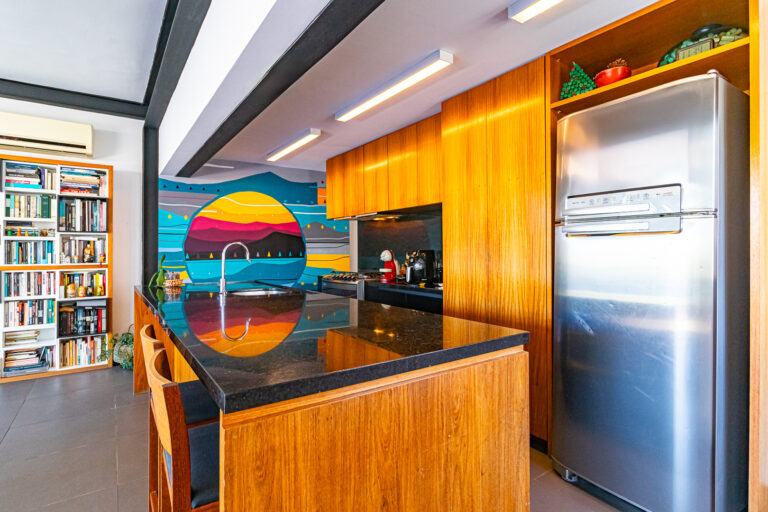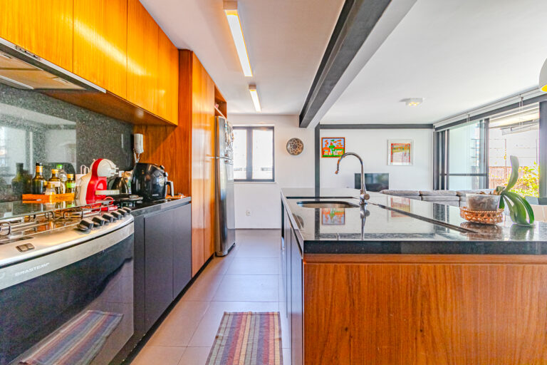 A cozinha é um escândalo, com ilha e uma linda marcenaria. Tem ainda área de serviço separada e mais um banheiro social, que funciona como um lavabo, mas tem chuveiro também.