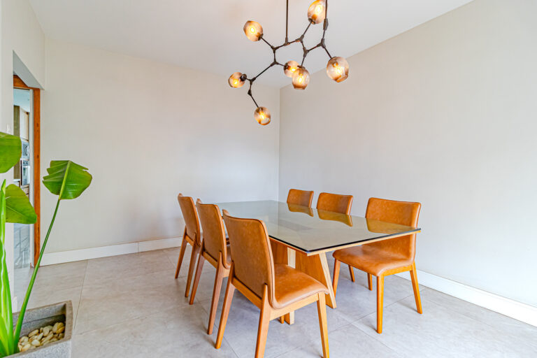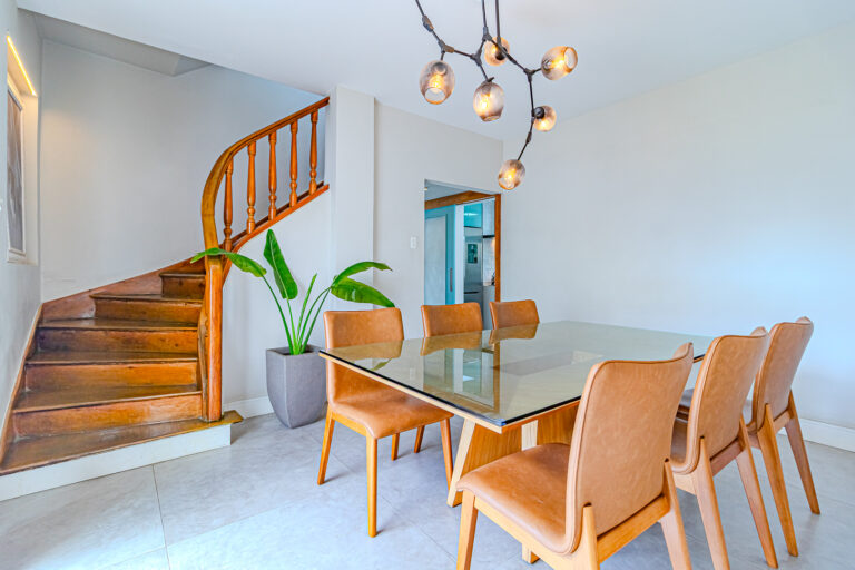 Ao entrar no imóvel, você se depara com uma belíssima sala de estar/TV, super clara, com imensas janelas por todos os lados e integrada a uma varanda bastante charmosa. Ao lado, fica a sala de jantar, também integrada à varanda e no mesmo ambiente onde está a escada linear que leva ao 2º pavimento. Tudo isso apoiado por um banheiro social, para ser usado para quem está neste piso.