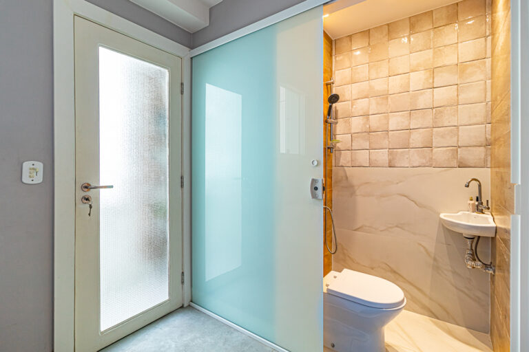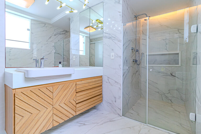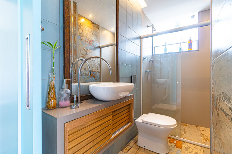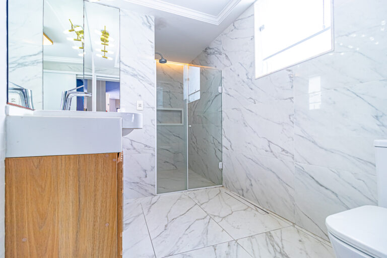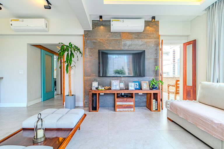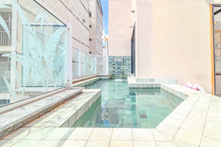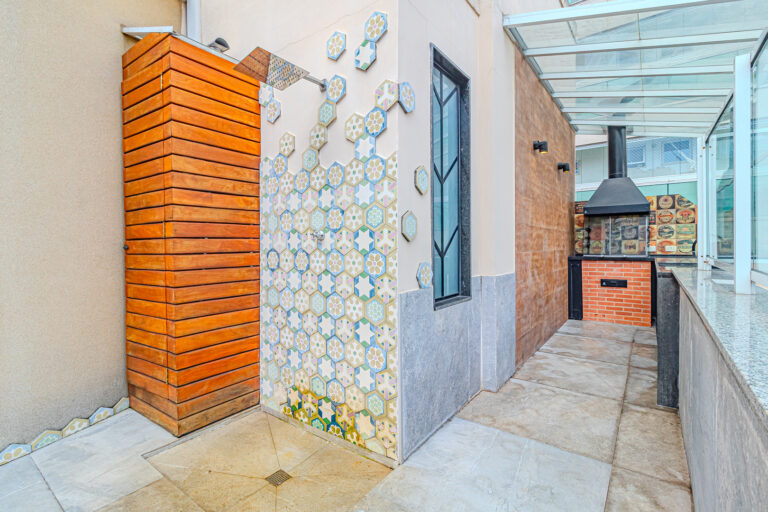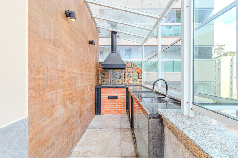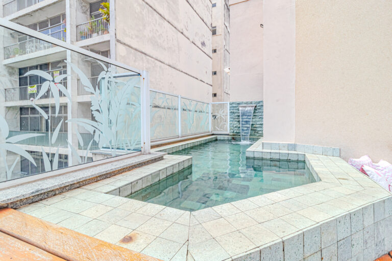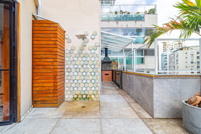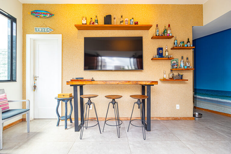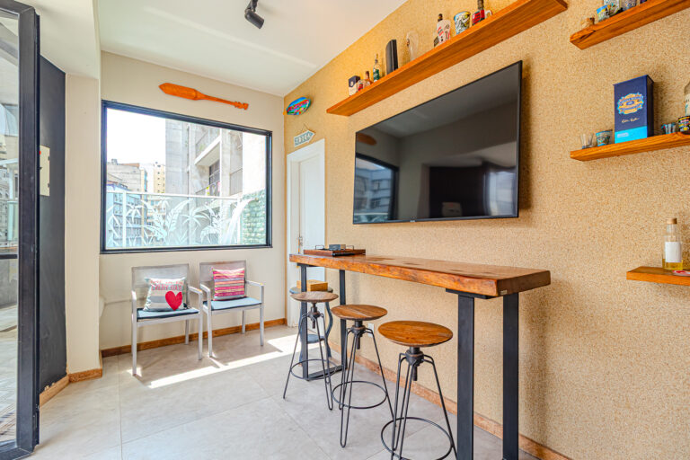 No pavimento superior há um terraço super confortável, com piscina, churrasqueira e chuveirão, além de uma sala de TV com geladeira para não faltar nada quando você receber amigos no seu apê.