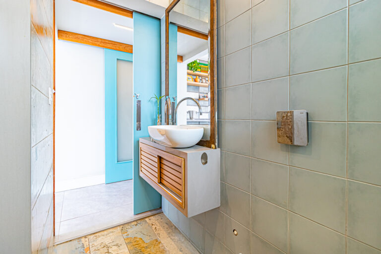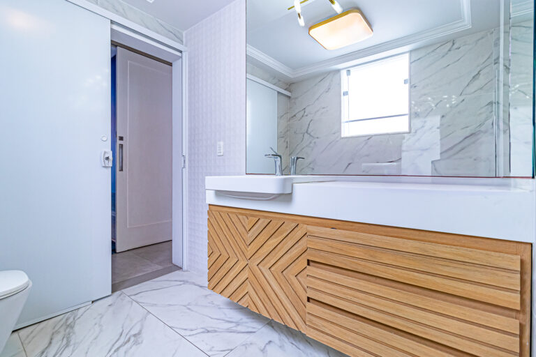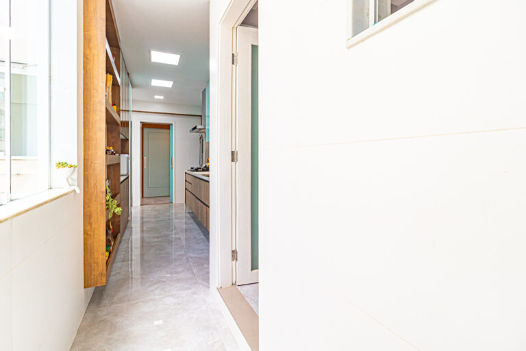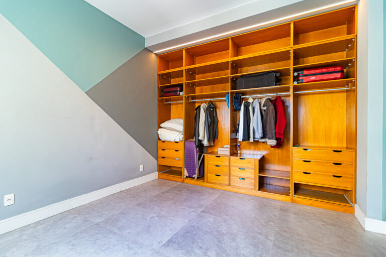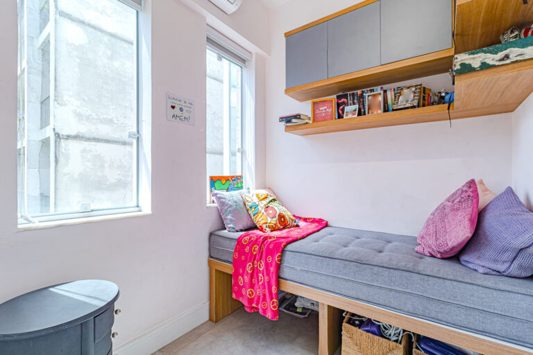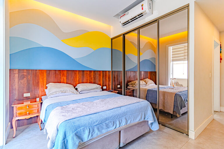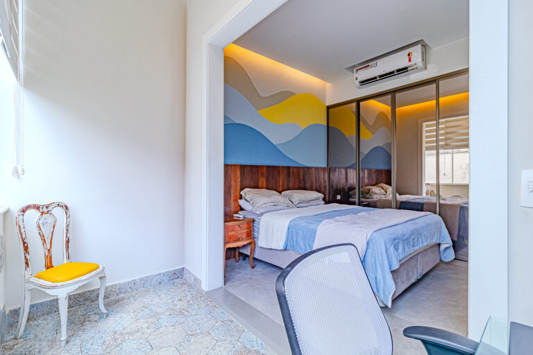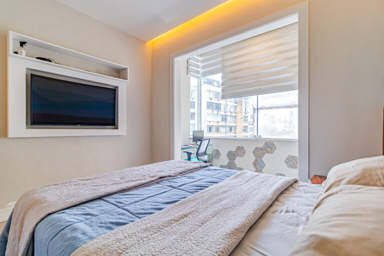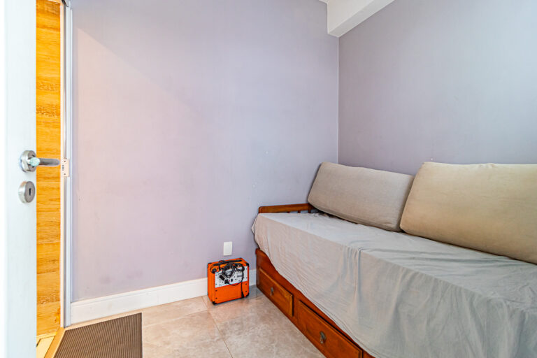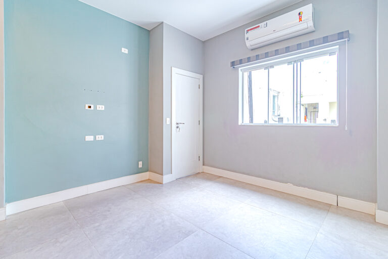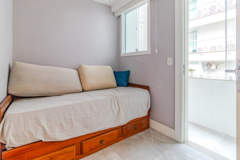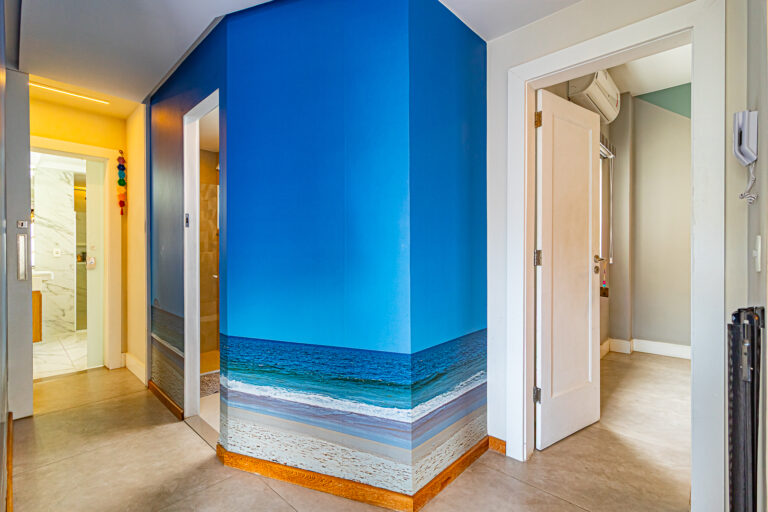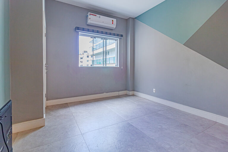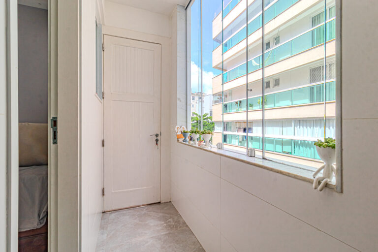 Neste mesmo pavimento ficam os 3 quartos, sendo 1 ampla suíte com closet e varanda interna. O 2º quarto é espaçoso e conta com uma pequena vista para o mar. O 3º quarto é pequeno, mais apropriado para ser usado como quarto de hóspedes ou escritório. Todos os cômodos contam com marcenaria planejada e aparelhos de ar-condicionado tipo split e os banheiros são ventilados naturalmente.