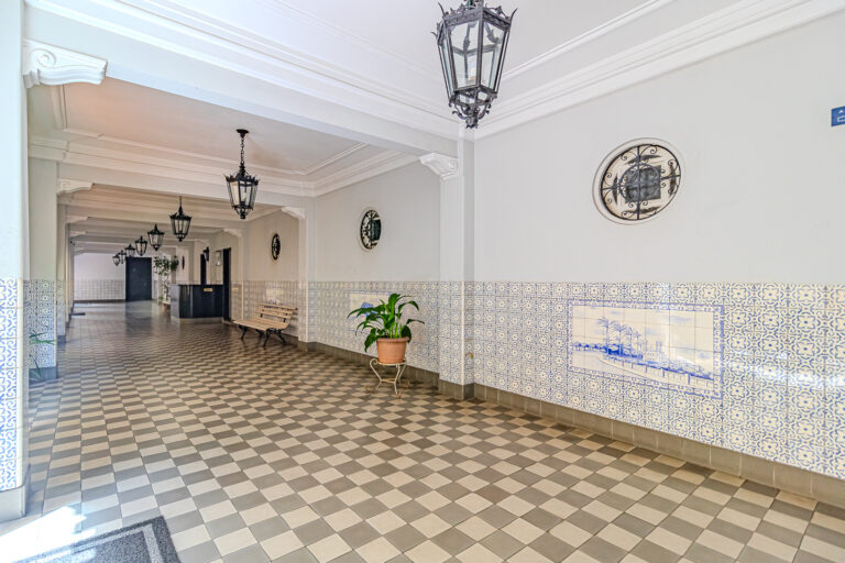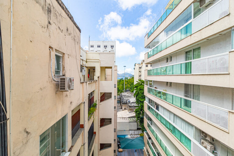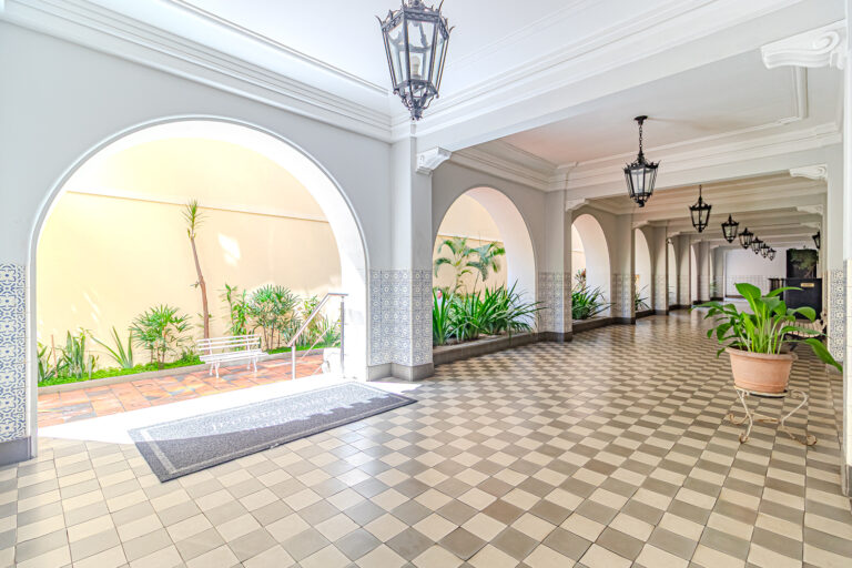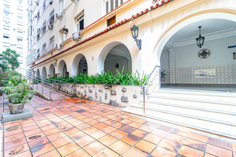 O prédio não tem infraestrutura mas é daqueles típicos e charmosos edifícios do Flamengo da década de 50. O hall que leva aos elevadores é incrível, cheio de arcos, luminárias e azulejos portugueses. Tudo muito bem conservado e cercado por um belo jardim.